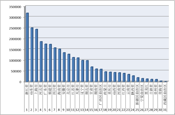 2016年1-9月各省(區(qū)、市)拍賣成交情況 1-9月,我國31個?。▍^(qū)、市)拍賣成交額超過200億的有3個?。▍^(qū)、市),分別是浙江省、山東省、上海市(見圖3)。3個?。▍^(qū)、市)共計成交809.83億元,占上半年全行業(yè)拍賣成交額的28.37%。 拍賣成交額在100-200億區(qū)間的有9個省(區(qū)、市),分別有河北省、廣東省、福建省、四川市、海南省、安徽省、北京市、江蘇省和天津市,3個省(區(qū)、市)共計成交1323.96億元,占上半年全行業(yè)拍賣成交額的46.38%。 拍賣成交額在20-100億區(qū)間的有12個?。▍^(qū)、市),分別是遼寧省、湖北省、甘肅省、湖南省、廣西區(qū)自治區(qū)、內(nèi)蒙古、重慶市、山西省、河南省、江西省、云南省和陜西省,12個?。▍^(qū)、市)共計成交651.93億元,占上半年全行業(yè)拍賣成交額的22.84%。 拍賣成交額在1-20億元的有7個?。▍^(qū)、市),分別是寧夏自治區(qū)、新疆自治區(qū)、貴州省、黑龍江省、吉林省、青海省和西藏自治區(qū)。 ![]() 圖3 2016年1-9月各?。▍^(qū)、市)拍賣成交情況 |